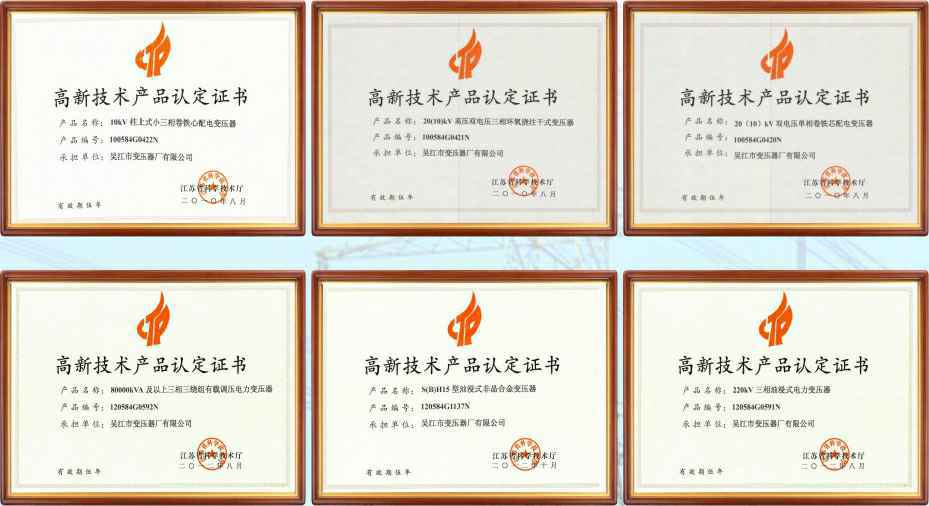2009年,十大类产品通过省经信委新产品鉴定。2011年,二大类产品通过中国机械工业联合会的新产品鉴定(1) SSZ11-80000/110三相三烧组有载调压电力变压器(2) sS11-240000/220三相三 绕组无励磁调压电力变压器(该产品于2012年通过“江苏省首台(套)重大装备及关键部件认定”)